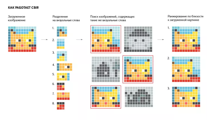 Эта методика работает по определенному алгоритму. После того, как будет загружено необходимо изображение, оно превращается поисковой машиной в комплект визуальных слов. Они являются удобными поиску численными элементами картинки (черты объекты, зоны контрастности). Затем поисковой машиной отбираются среди общего числа загруженных картинок, которых в сети миллиарды, те изображения, которые содержат подобные визуальные слова, отсеивая все остальные.