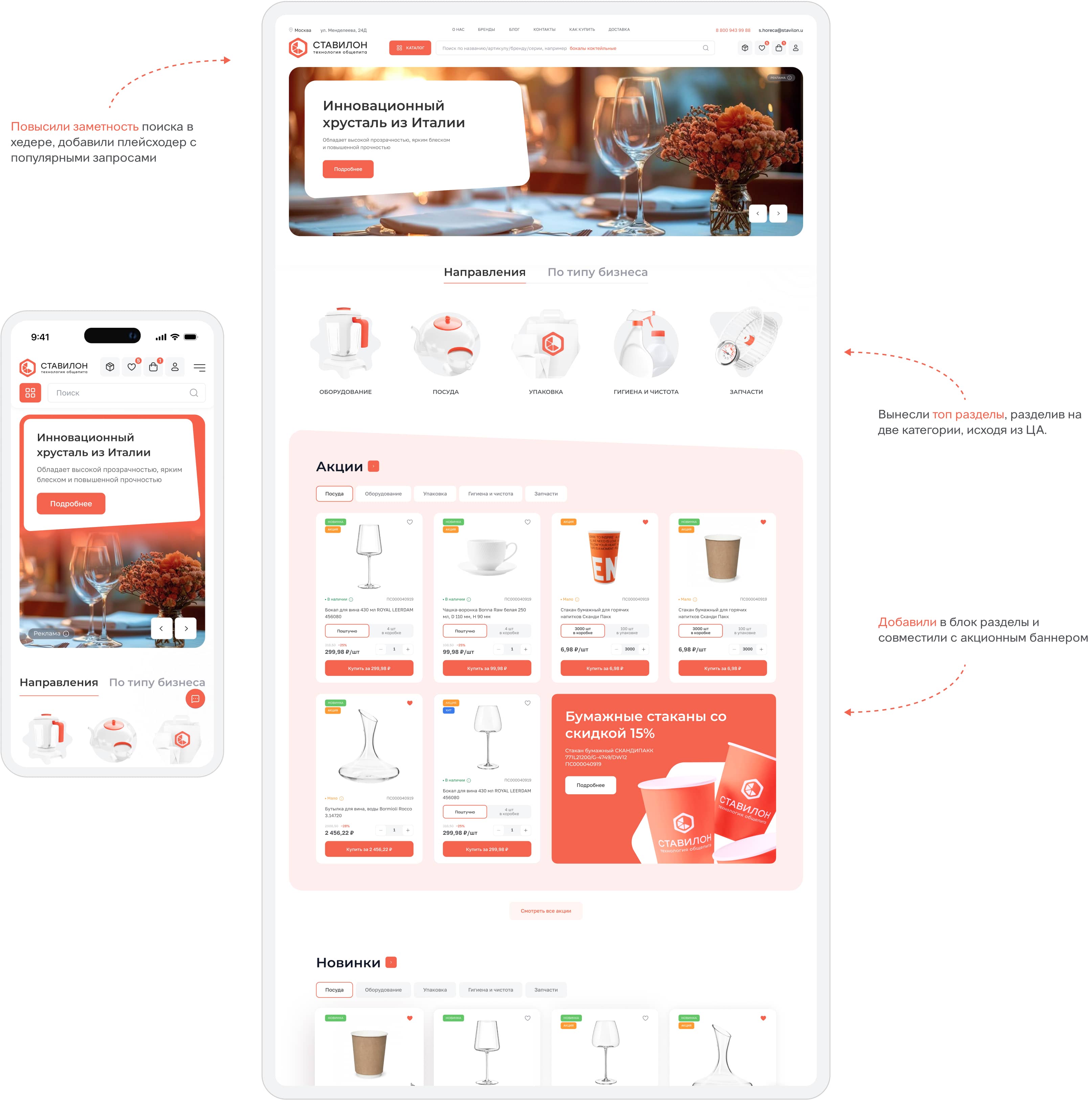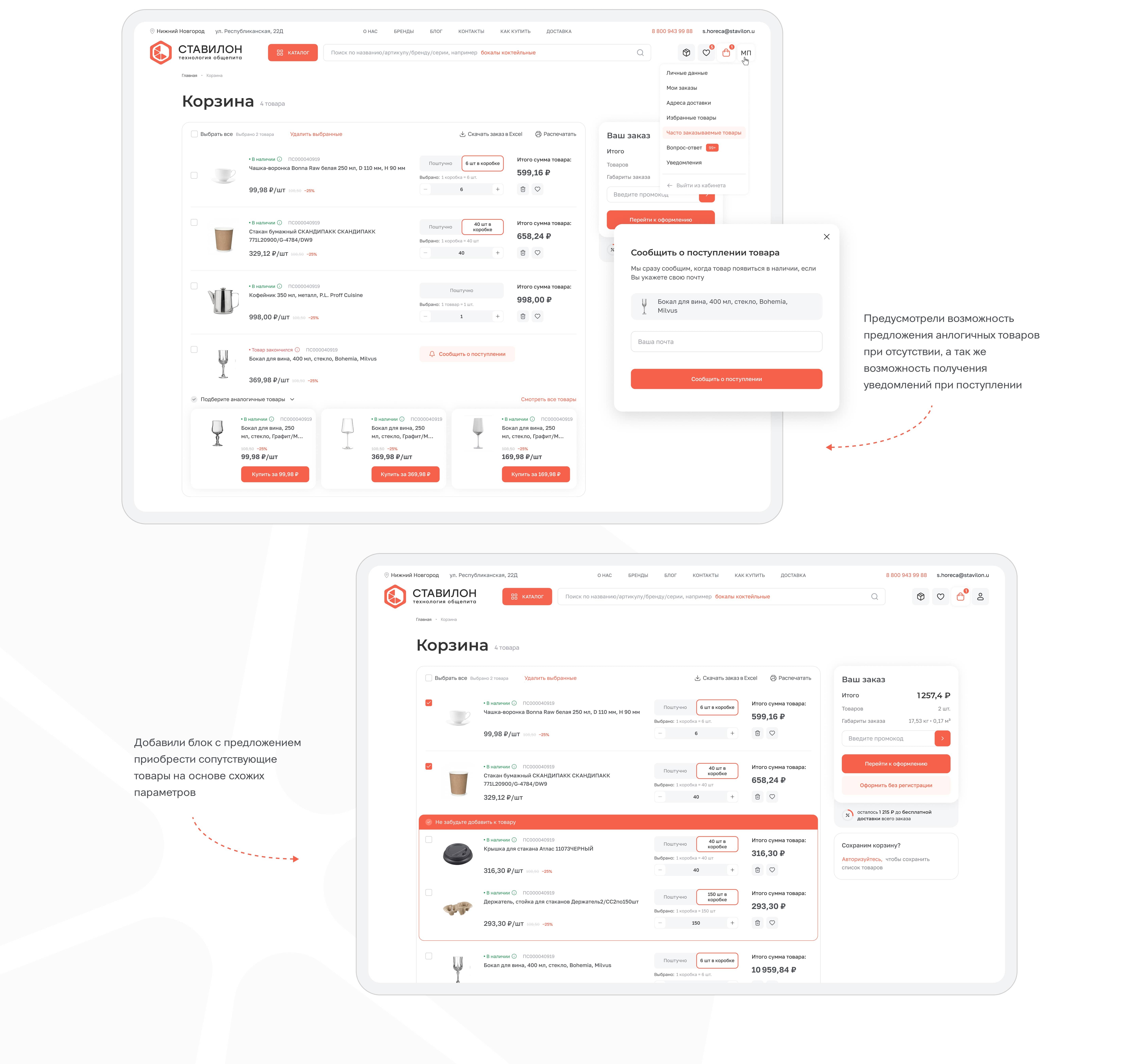Если пользователь захочет купить для ресторана 20 коробок бокалов, нужно сделать так, чтобы пользователь сразу увидел: сколько штук в коробке, сколько коробок он добавил, как изменилась цена.