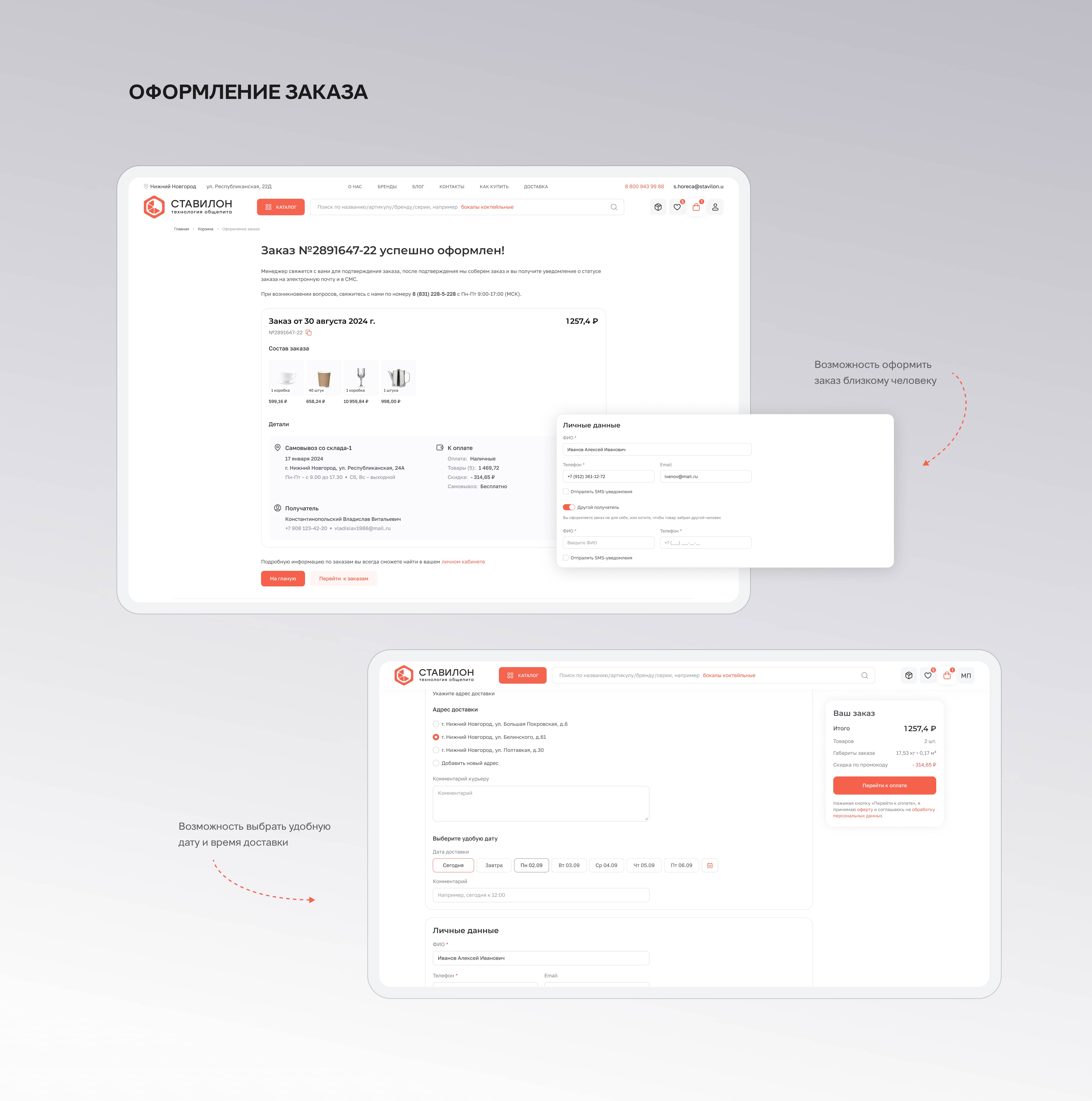 Но еще у нас были референсы от клиента — ему хотелось добавить необычные формы как у ВкусВилла. Мы добавили такие необычные формы, сохранили визуальный фирменный стиль «Ставилона» и доработали логотип. А еще добавили на сайт анимацию, что сделало сайт живым и интерактивным. Суммарно мы предложили восемь дизайн-концепций, но утвердили девятую — она стала синергией идей из предложенных нами концепций.